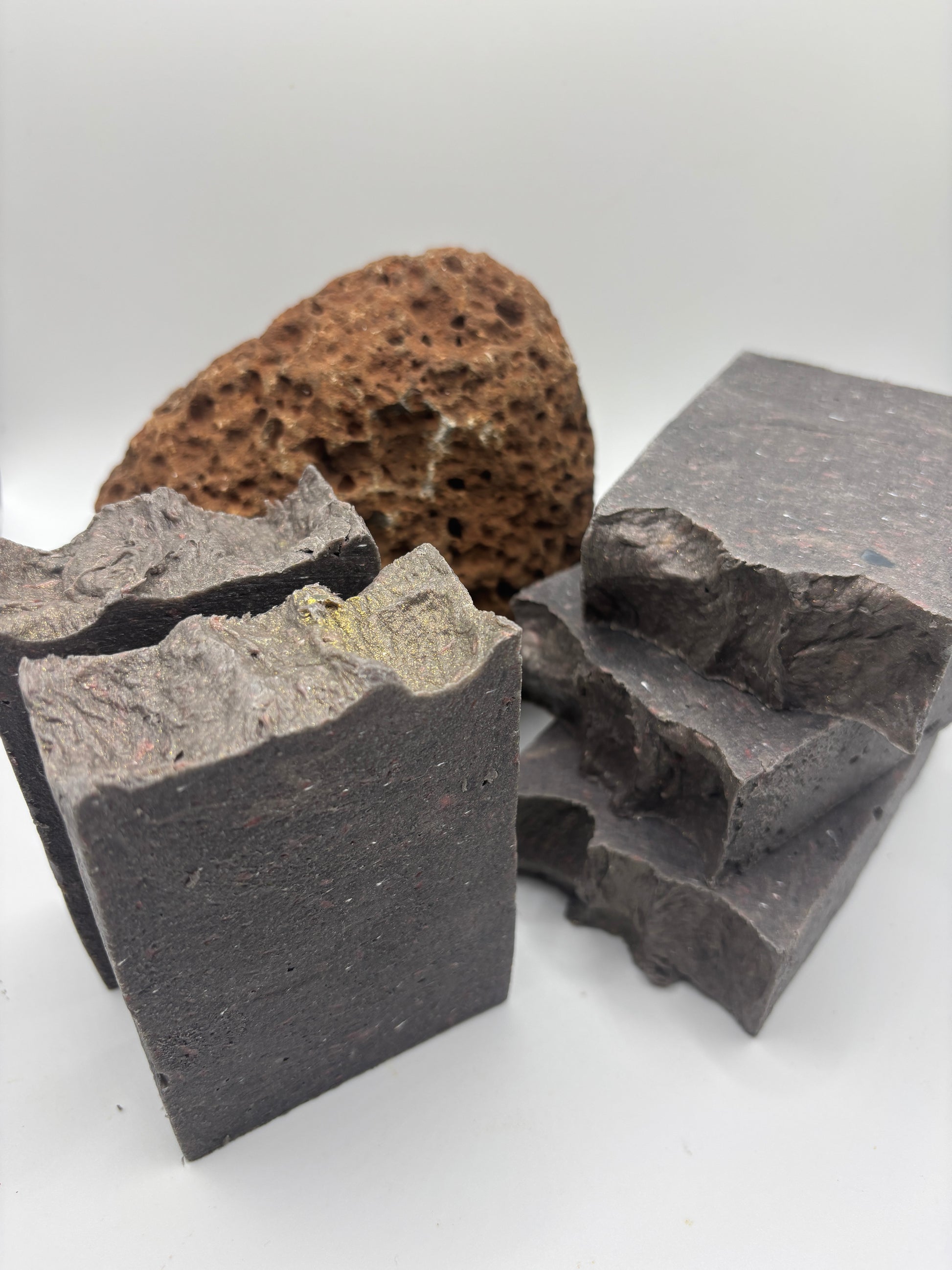 Its dramatic dark blackberry color is reminiscent of volcanic stone, giving this bar a striking, earthy appearance that stands out on any sink or shower shelf.