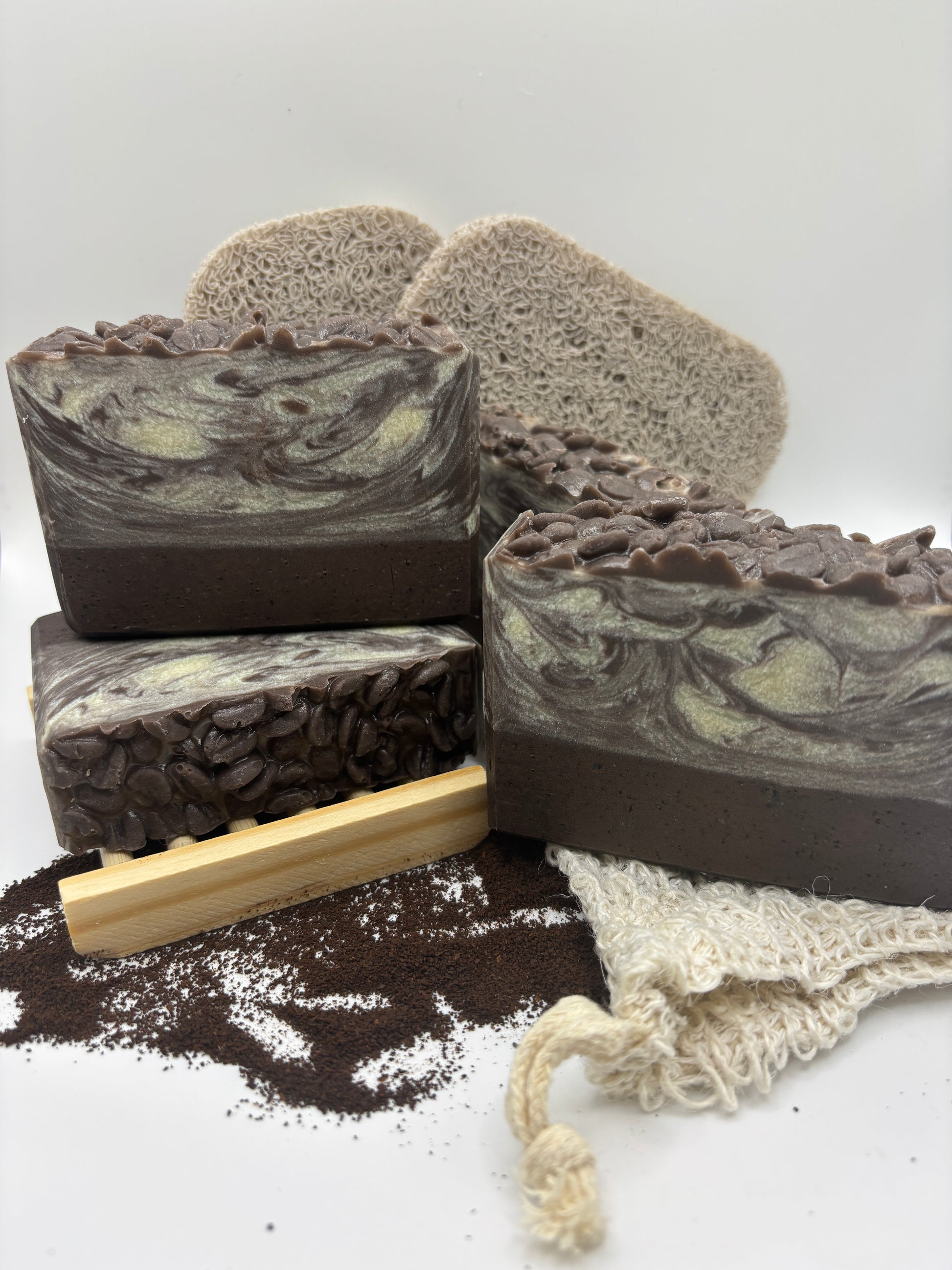 Ingredients: Olive Oil, Distilled Water, Organic Palm Oil, Coconut Oil, Sodium Hydroxide, Shea Butter, Sweet Almond Oil, Coffee, Castor Oil, Fragrance/Essential Oils, Sodium Lactate, Mica, Titanium Dioxide