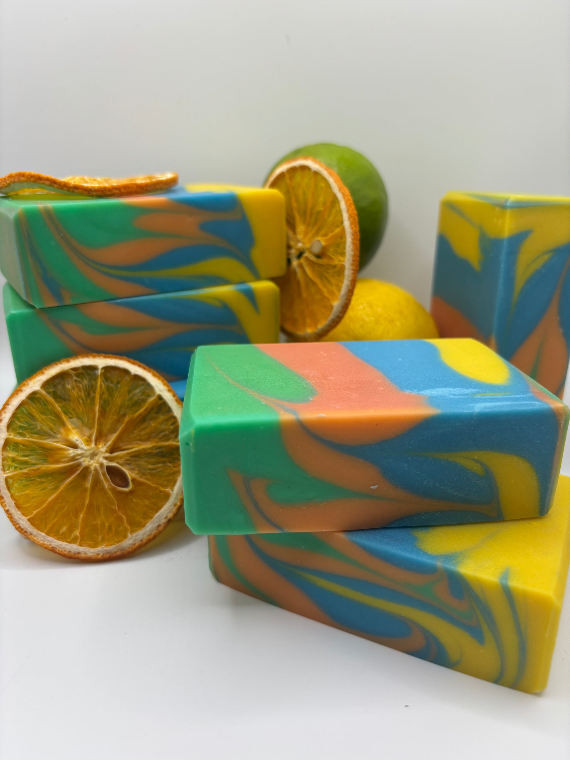 Rise & Shine awakens your senses with a vibrant citrus blend that combines zesty grapefruit, bright lemon, and tangy lime with tropical pineapple notes. Subtle undertones of cucumber, blackberry, and jasmine add depth and sophistication to this energizing bar. Hand-swirled in striking shades of green, orange, blue, and yellow, each bar is a visual celebration of natural beauty. Perfect for starting your day with an invigorating cleanse that engages both body and mind.