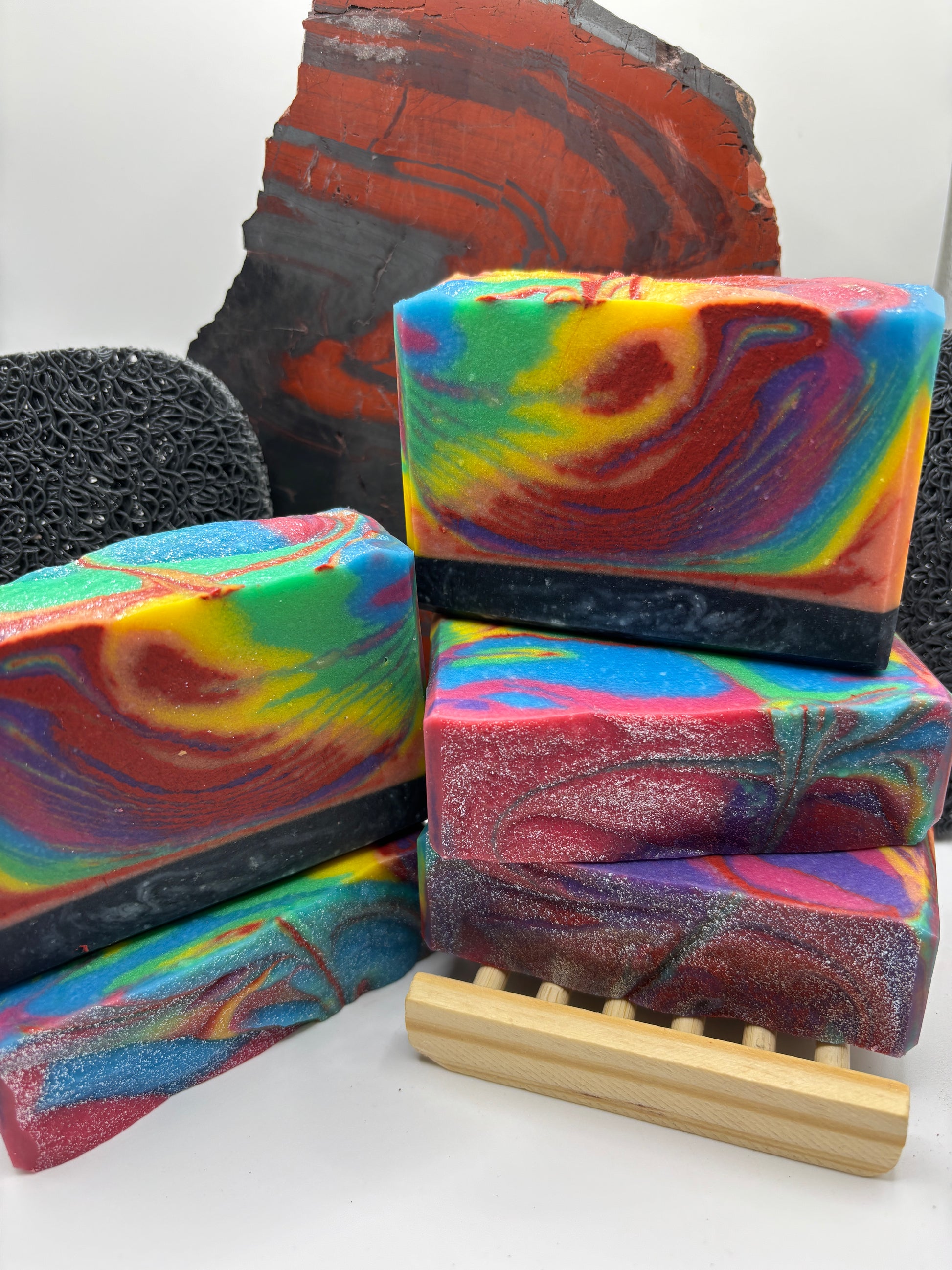 Introducing Vortex, a striking artisanal soap bar that captures nature's dynamic energy. The deep black base contrasts beautifully with a swirled rainbow top reminiscent of atmospheric patterns, making each bar a visual masterpiece. This sophisticated blend opens with bright bergamot and juicy blackberry, then unfolds into a floral heart of peony, honeysuckle, and violet leaf. The composition settles into a warm, grounding base of woods, amber, and musk that lingers on the skin. Expertly crafted for those who appreciate both aesthetic appeal and complex fragrance profiles, Vortex delivers a sensory experience that transforms your daily cleansing ritual into a moment of refined indulgence.